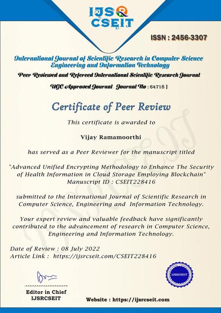 International Journal of Scientific Research in Computer Science, Engineering and Information Technology • 8th July 2022 Advanced Unified Encrypting Methodology to Enhance The Security of Health Information in Cloud Storage Employing Blockchain
