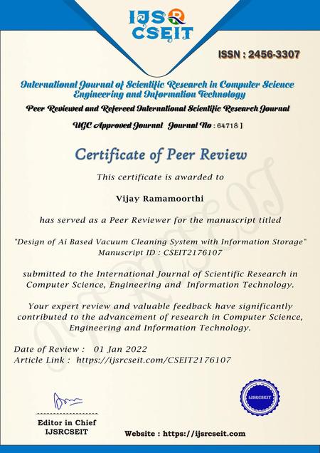 International Journal of Scientific Research in Computer Science, Engineering and Information Technology • 1st January 2022 Design of Ai Based Vacuum Cleaning System with Information Storage